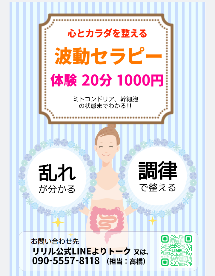 波動セラピーご予約受付中☆zipangu82024年5月2日読了時間: 1分更新日:2024年5月27日体験20分1000円です。 一般料金50分 ¥7000 80分 ¥9000 お気軽にお問い合わせください☆4月から開始し、大変ご好評いただいております!!